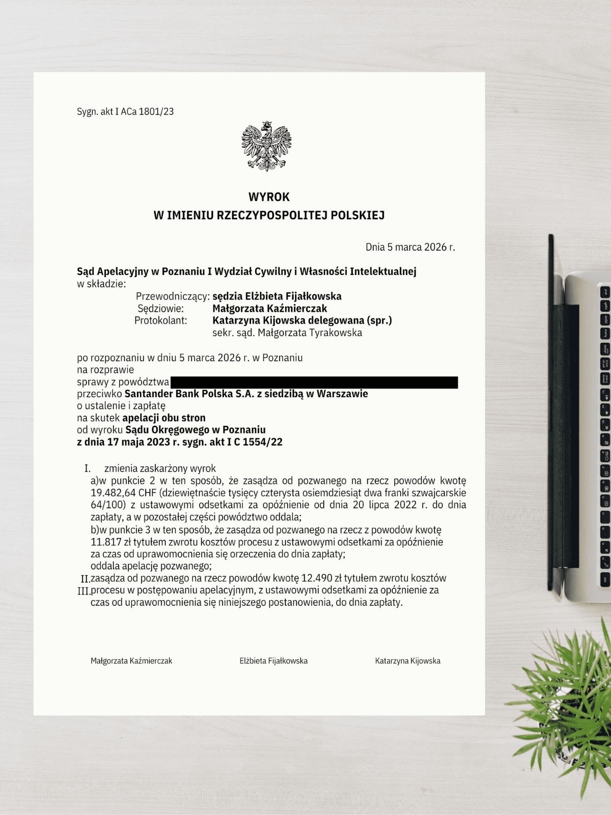 SA zasądził na rzecz klientów ponad 219.000 zł. Sprawa zakończona w 13 miesięcy. Wyrok prawomocnny.